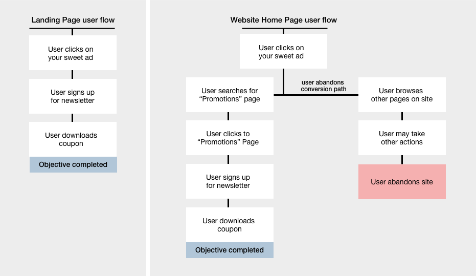 A campaign landing page vs. your website’s home page. One lays out a clear path to conversion. The other presents too many options.