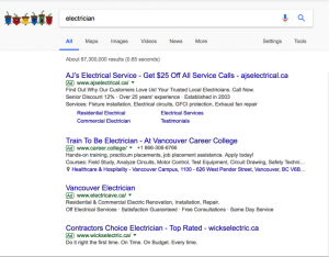 The reason Google ads are so powerful is that it gives you the results you are looking for. Google feeds you results that have search terms related to one of your keywords when you search for something. For example, 4 search ads pop up when I searched for ‘electrician.’ It targets me – an ‘active searcher’, who is on a mission to find an electrician. Using my search histories, Google can then distribute electrician related ads via its various platform ie. Display Network and YouTube videos later.