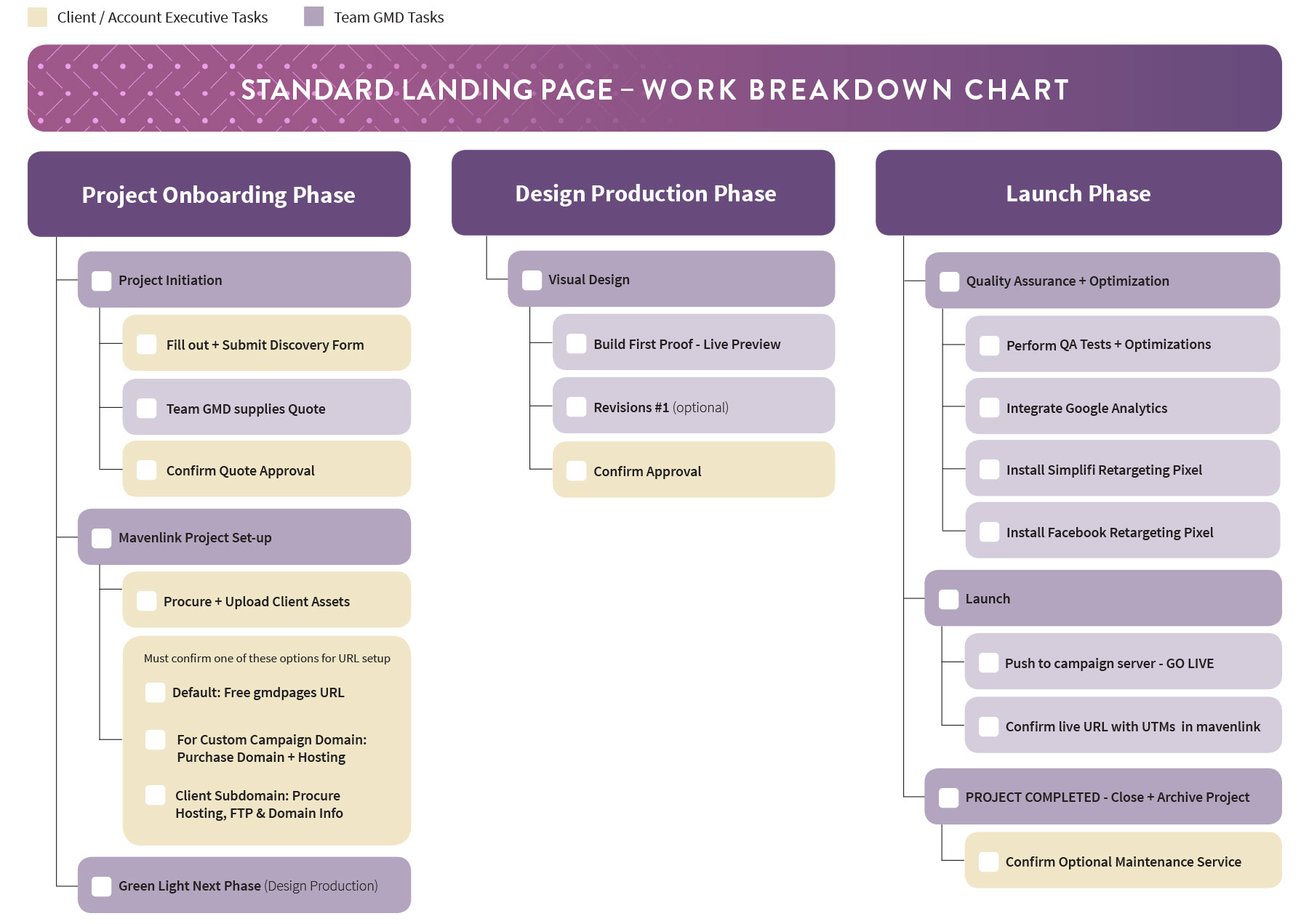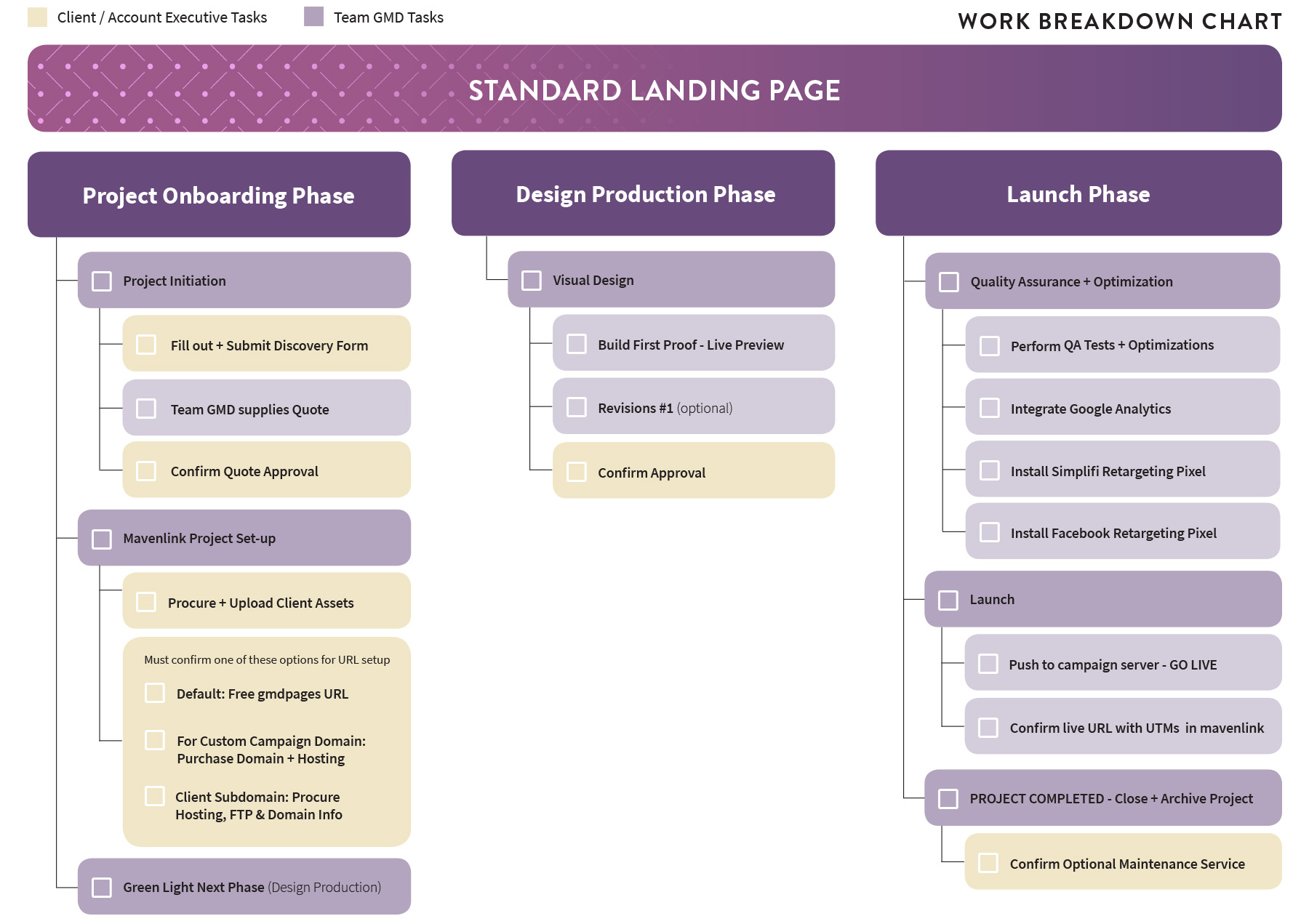 Each post in this series will feature a Work Breakdown Structure (WBS) chart, which visually breaks down the general phases and outcomes of individual services. For our inaugural WBC spotlight, we are highlighting the general steps required to design and build a Landing Page.