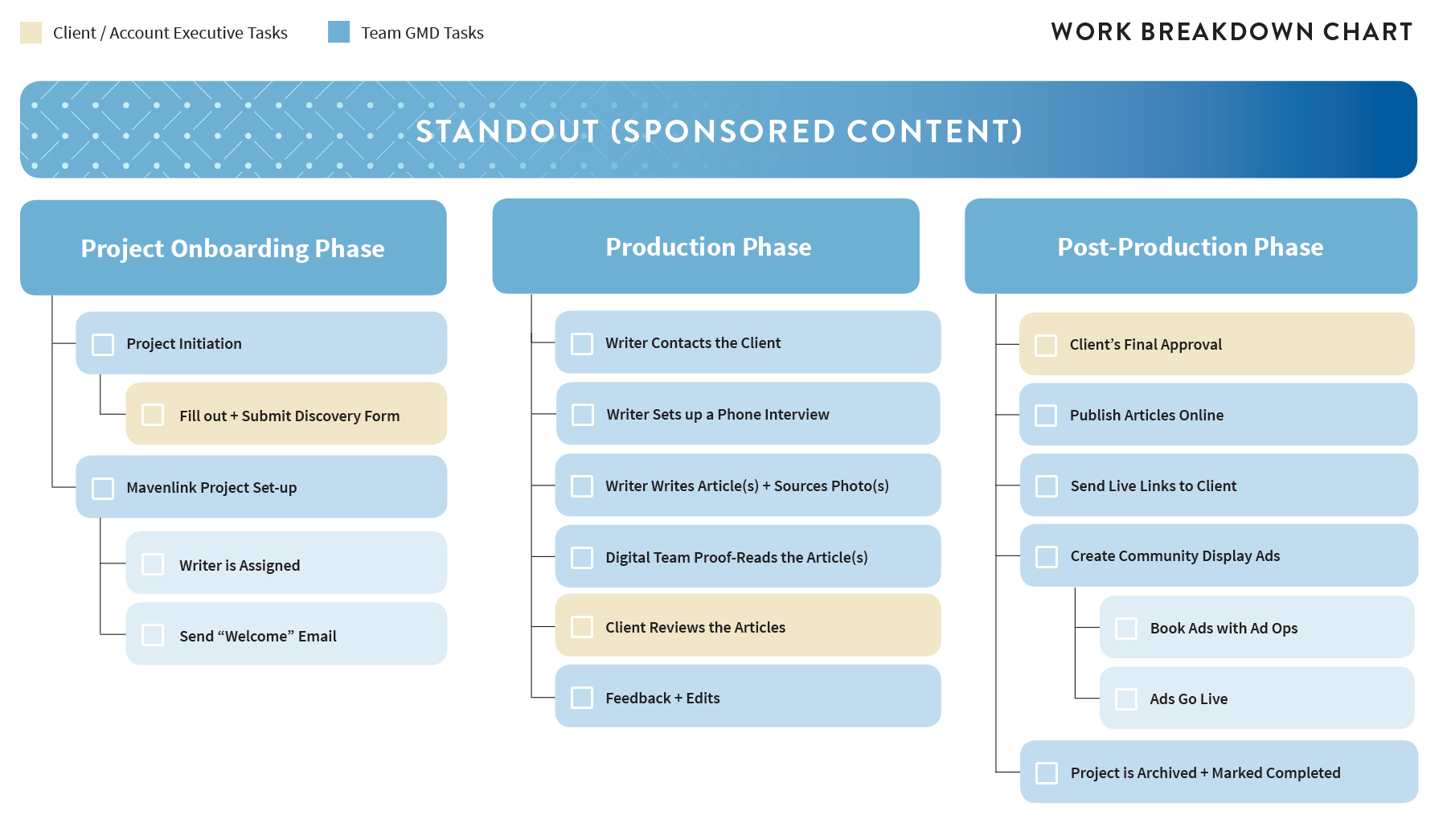 The Process Breakdown series uncovers the collaborative steps behind our service deliverables. The mission is to help you gain some awareness of the standard processes of our most popular services. Each post in this series will feature a Work Breakdown Structure (WBS) chart, which visually breaks down the general phases and outcomes of individual services.