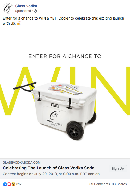 To carry this out, the design team geared up on assets and played into the notes that the client provided. Glass Vodka Soda’s main tagline would be “clean. pure. real.” We wanted to ensure that the mission statement of the vodka soda stated that this product is the purest and most organic vodka soda on the market. The design team ran with this and ensured that simple, sleek look was consistent throughout all assets. The designers built the landing page in a funnel. The first image promotes brand awareness with the product name along with the branding that the design team created. Below that, the tagline “clean. pure. real.” is displayed with some satisfying background imagery and some engaging information about the product. Finally, below that, visitors have the opportunity to see what the prize is and enter to win. The landing page tells a story and encourages engagement throughout.