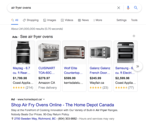 A shopping ad includes an image, the product title, the price, retailer name, and other retailer-specific information. These ads are triggered by pulling data from the website store and matching it with the relevant search queries.