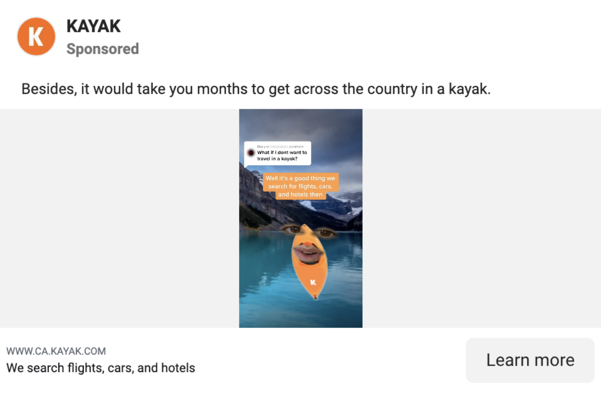 What: The advertiser is Kayak. The travel deal search site is widely known for its YouTube ad. The reel takes the form of a response video to comments received on their social media.