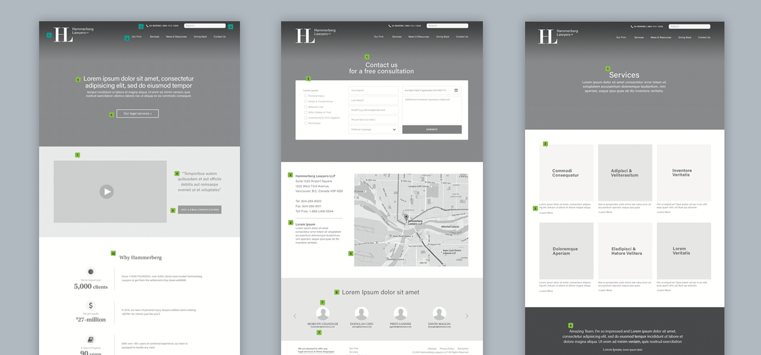 The purpose of a website wireframe is to demonstrate a site’s layout and function. The wireframe is an intentional framework graphic showing the placement of images with placeholder boxes and the ideal amount of text depicted in Greek copy. The reason for inserting this step into the creative process is that without image choices or actual photos, you can see the way the site works without distraction.