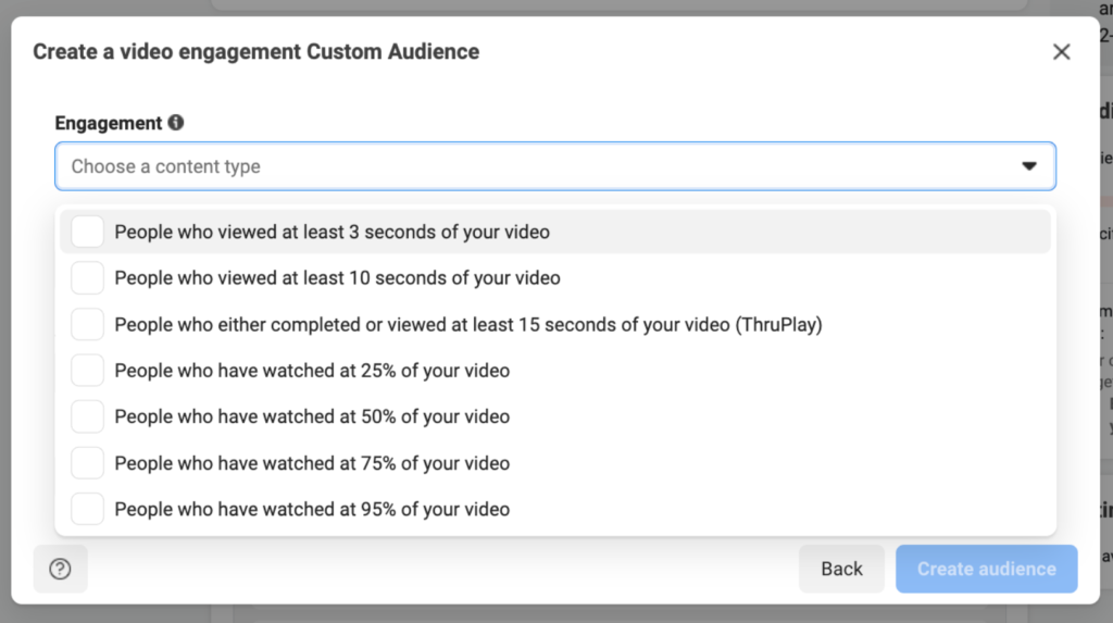 Pro Tip: When building a custom audience based on video views you can select the level of engagement the people you want included have had with your videos. This helps to further qualify the audience and ensure that campaign results are in line with campaign objectives.