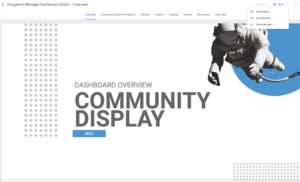 Community Display KPI Snapshot: This page displays all the key metrics on a single page, including impressions, clicks, CTR (click-through rate), site visitors, and more. On the right side, you will find a section where you can paste a Campaign AD and add relevant information. To utilize this feature, you may need to reach out to the DCs and request the necessary data. This is the only page where representatives may require assistance from the DCs. All other pages should be self-explanatory and user-friendly.