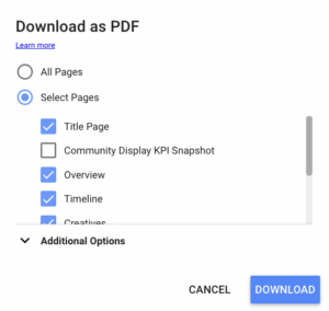 To share the report with your client, simply click the down-arrow next to the “Share” button and select “Download Report.” You have the option to download all pages or choose specific pages based on your client’s needs. After selecting your preference, click “Download” and patiently wait for the system to generate the report.